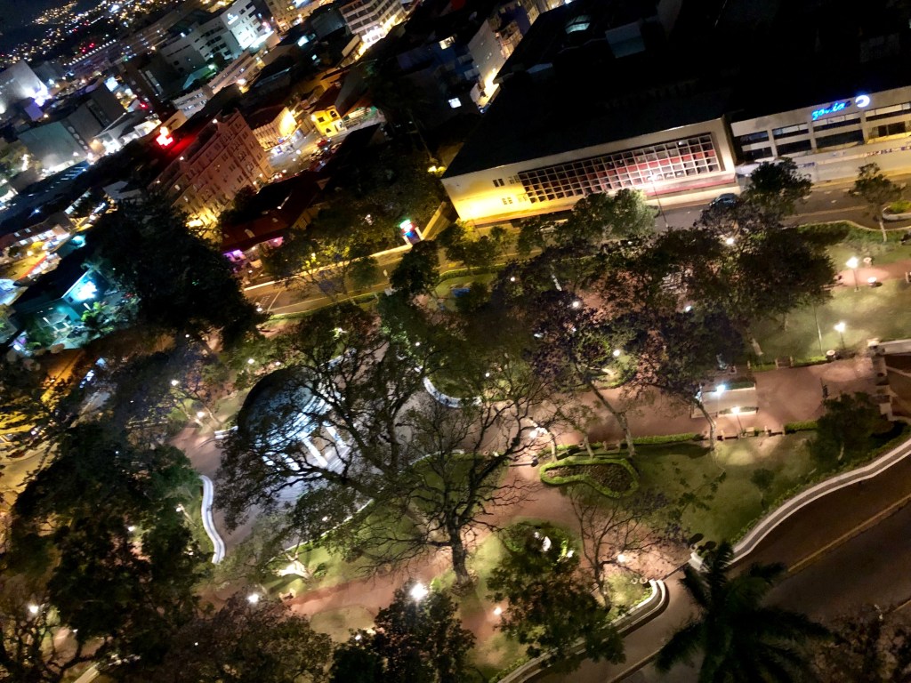 - En el hotel Aurola (Holiday Inn), sube a su piso 17 para admirar San José a tus pies mientras te deleitas de una deliciosa comida con un buen vino. Admira la vista desde arriba el parque Morazán iluminado con su Templo de la Música