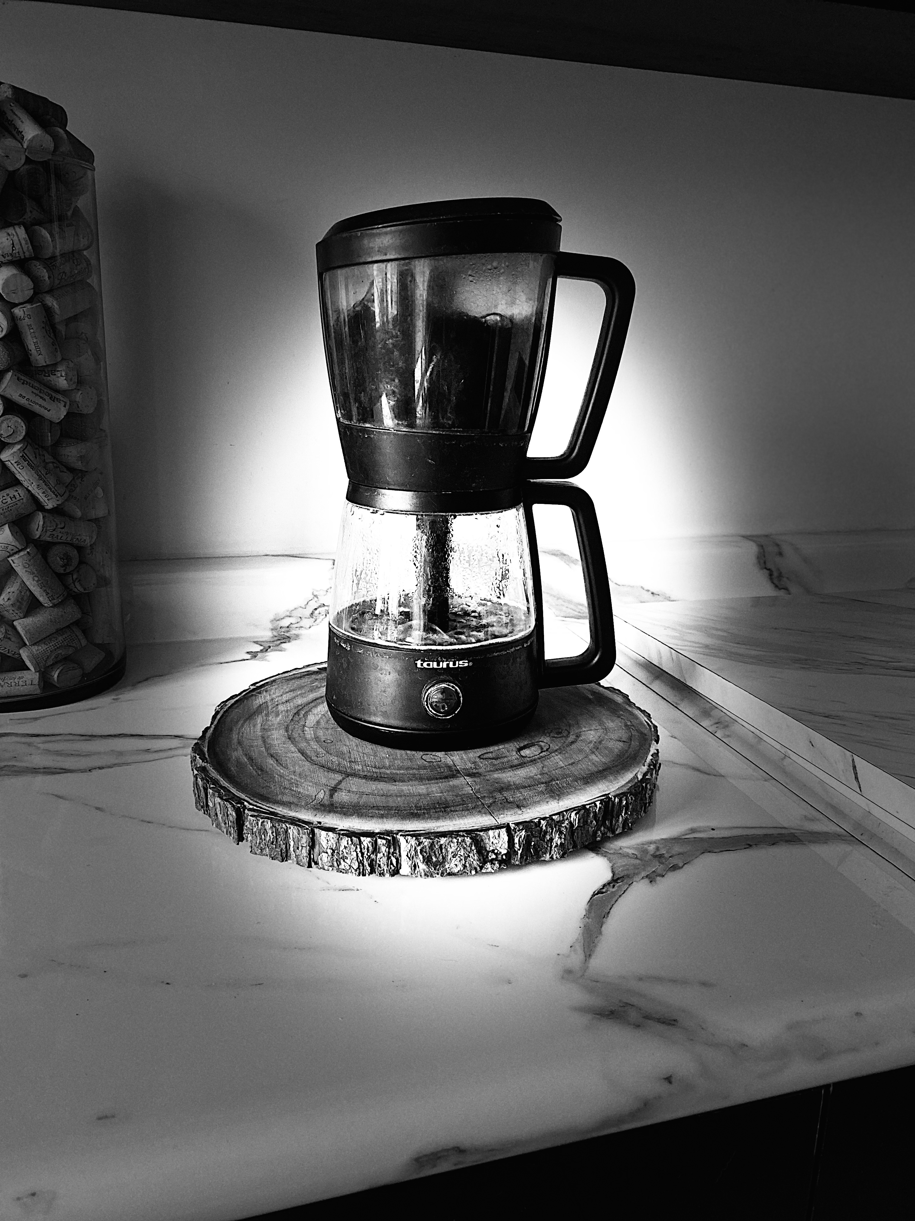 Quería una cafetera diferente, no la de goteo que está en todas las casas, así que la mía parece un reloj de arena grande; el agua se coloca en el compartimiento de abajo con un cilindro en el centro que le permite conectar la otra mitad donde se pone el filtro de plástico y el café de grano. Cuando la tapas y conectas empieza a hervir el agua y cuando las burbujas del hervor comienzan a aparecer, el agua es empujada hacia arriba, como extraída al vacío y se mezcla con el café haciendo una infusión. Me encanta ver como se hacen las olas de café, es como la arena arrastrada en el mar o como las faldas de las bailarinas de folklore, son espirales en forma de caracol que se unen revoltosos.